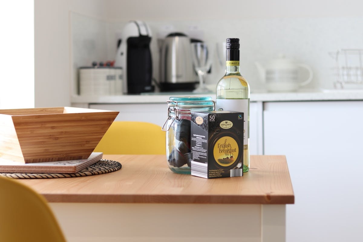 Kitchen with electric oven and hob, fridge with freezer box, microwave, Nescafe Dolce Gusto Coffee pod machine, washing machine and dining table with two chairs