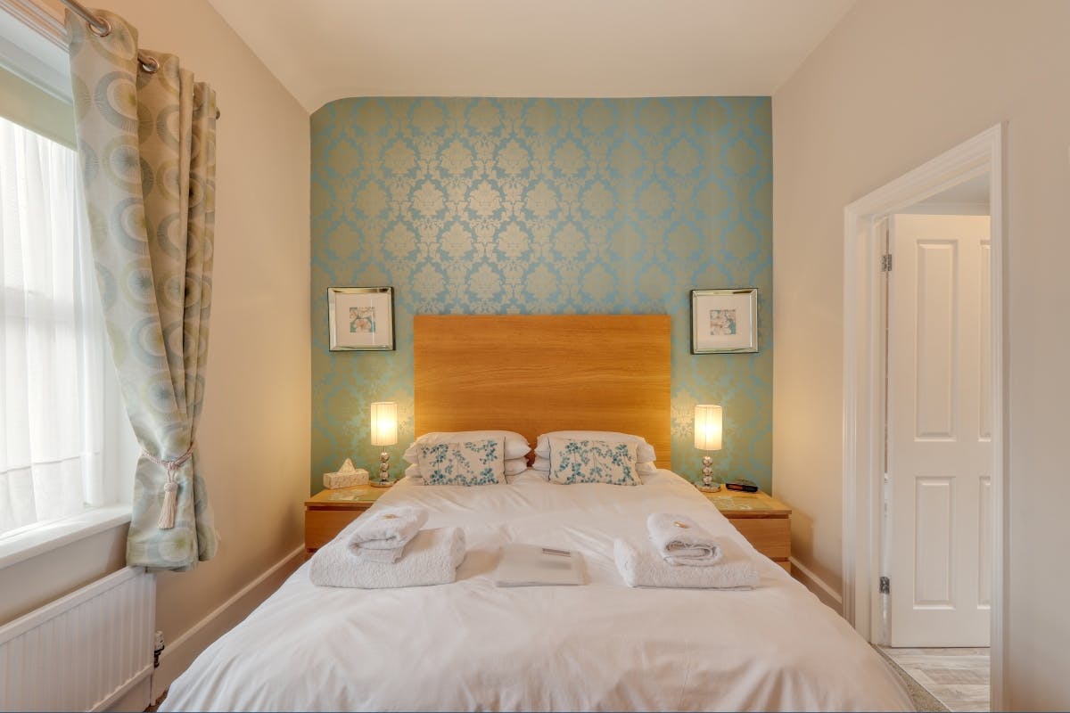 This first floor king-sized room is larger than a double room. The cosy king sized bed ensures a good night’s sleep, and the en-suite benefits from a bath (with shower over).