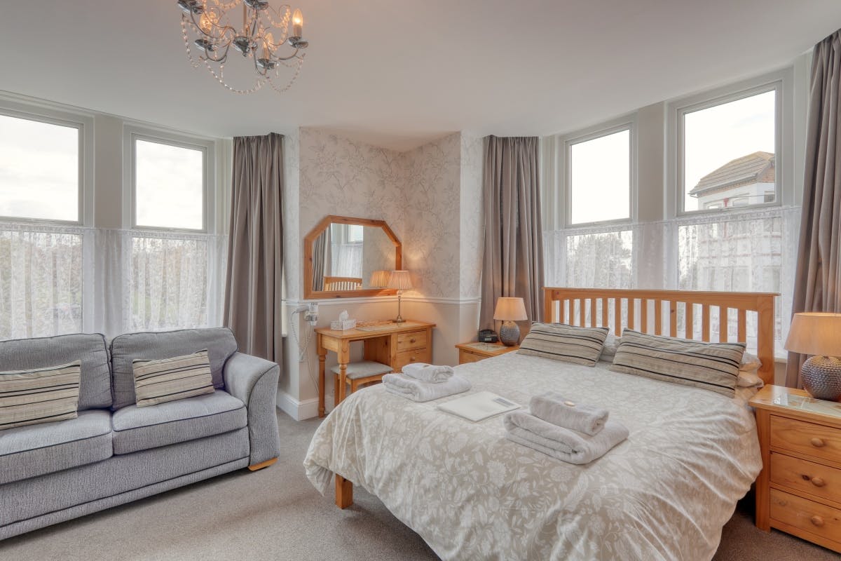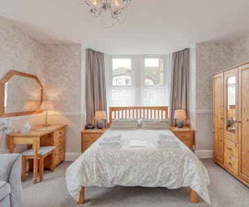 A spacious first floor superior double room with two large bay windows. This dual aspect ensures the room enjoys full sunshine for most of the day.